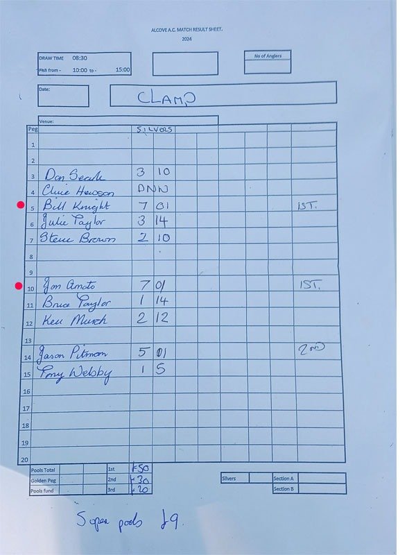 So, after all that, my nearest and dearest lent me her car and persuaded me to fish the Alcove Club match held at The Clamp last Sunday…LOL. I didn’t need much persuading, especially as I haven’t fished the Clamp this year and it’s such a lovely little lake, full of surprises. You just never know what you’re going to catch each time the float goes under. It could be a carp, an F1, a crucian, a tench, a skimbo, a roach, a perch, a rudd, a hybrid, or even a gudgeon. There are 15 pegs on the lake, but this match was limited to 10 anglers due to the low water levels and 2 keepnets were required so that any F1s could be kept separate from the rest of the fish. No carp were allowed on this one either, which makes for a fairer match. So, onto the draw…
