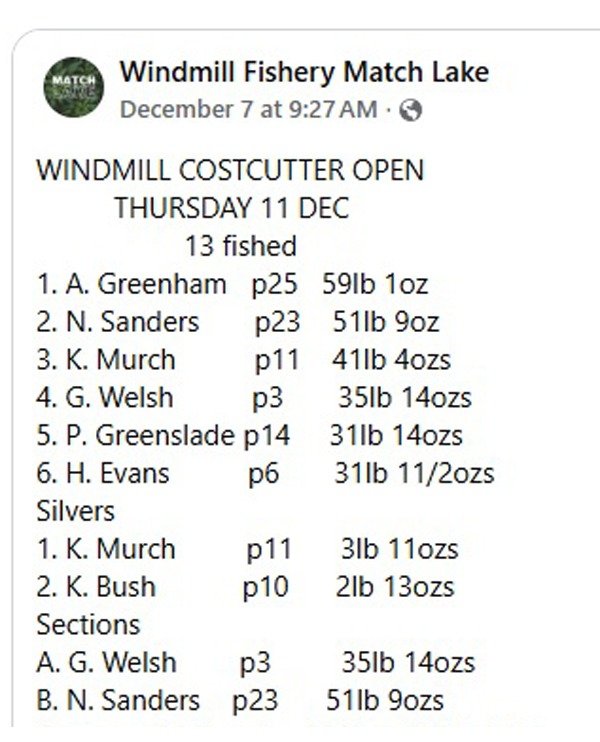 It’s been a tale of 2 matches last week, beginning with an unusual draw putting paid to my plans at Windmill on Thursday. Anyway, we had 13 anglers turn up for the Windmill Costcutter and as usual, I wanted to be drawn in the deeper water. Pegs 1, 2, 22, 23 and 25 are the pegs to be on at the minute, as the carp seem to have shoaled up on these deeper pegs. That doesn’t mean you can’t catch on any of the other pegs. It just means there are currently more carp on the deeper pegs. Maggles seem to be the in-bait on all of the pegs and light rigs are producing the most bites. It’s simply a case of getting your rigs balanced. My preference right now is for a no. 8-10 elastic in the top 2, with 0.15 (5lb BS) mainline and a 0.12 hooklength.
