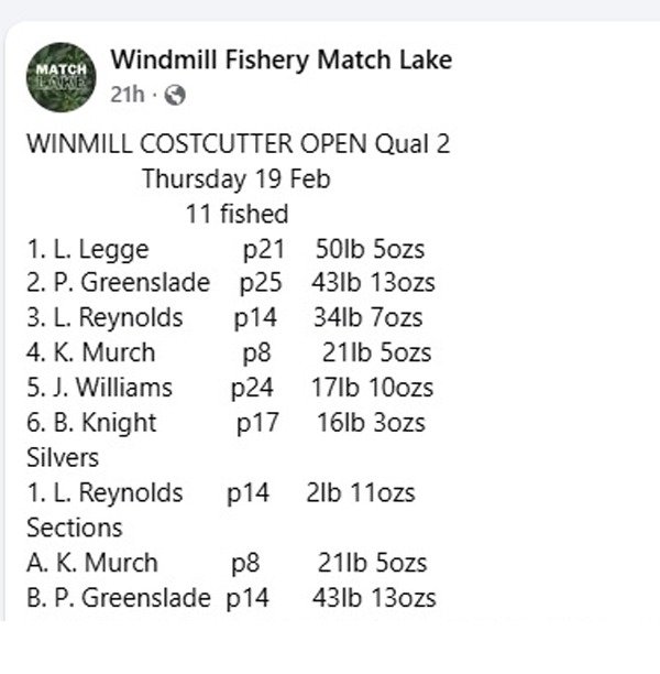 Well, that’s my roundup for the week. Those who couldn’t fish didn’t miss anything and those who did are now back on therapy, until the next match at least. So, Thursday 26th is the date for the next Windmill Qualifier and I’ll be there… in body and spirit, if not in mind. Look out for my next blog to find out how it all pans out. Keep you posted!