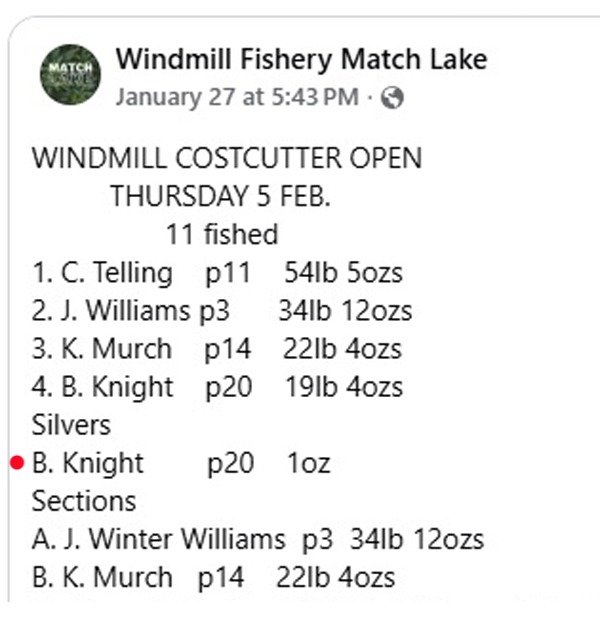 Thursday 5th February – Costcutter Open, Windmill Fisheries