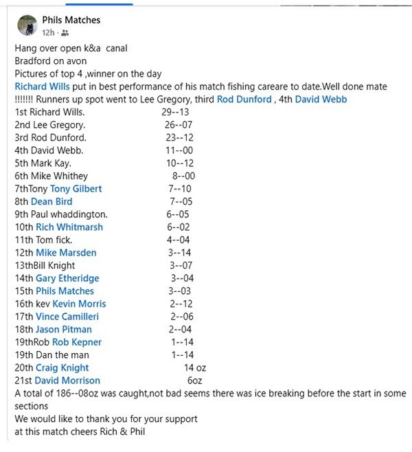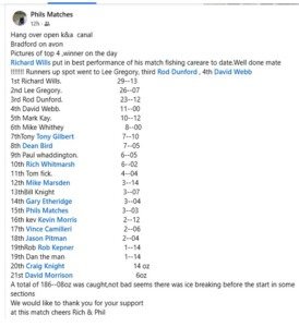 Well, that was the only fishing I managed to get in over the Christmas break. I did have a go on Sunday, 4th, on the Feeder Canal with Jason, but after more than 2 hours without a bite in the sub-zero temperature, we came to our senses, packed up and went home. I was booked in for the Costcutter Open at Windmill on Thursday 8th, but that one has now been cancelled. I’m hoping the weather will allow us to fish the next round of the Alcove Winter League on Sunday, 11th… keep you posted!